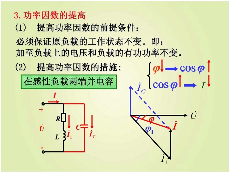 如果供电线路上的电压降过大,就会 造成电网末端的用电设备长期处于低压运 行状态,影响其正常工作。为了减少电能 损耗,改善供电质量,就必须提高功率因数。