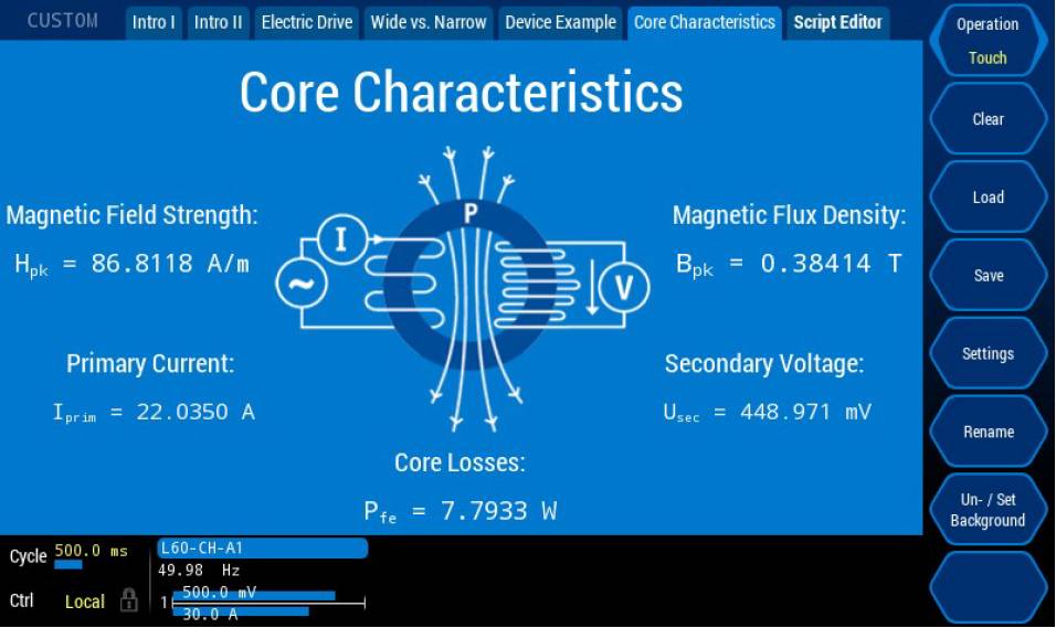 在这种情况下,功率损耗Ploss = Utrms × Itrms× cosφ。使用这个测量电路,一次侧的铜电阻造成的电压降没有影响,因为一次侧电路只测量了电流值。为了测量真正的磁化电压,二次侧回路没有电流通过。一次侧和二次侧的铜损同时排除在被测的功率损耗之外。由于对Utrms、Itrms和cosφ的精确测量,不需要对磁滞回路进行积分和动态运行,损耗可以通过LMG系列产品直接测量、实时的显示和读取。