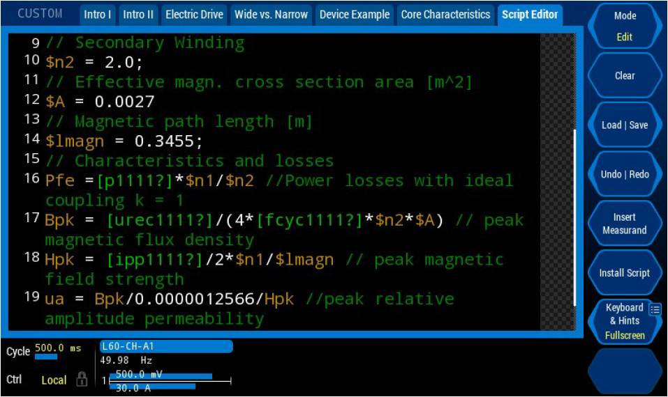 高精度功率分析仪与电源及被测设备的接线图见图1。在公式编辑器中编辑公式之后(图2),可以实时读取(图3)和/或存储计算值。特别是磁场强度、磁通密度、相对幅值导磁系数等这些无法直接测量的数值可以在屏幕中实时显示。