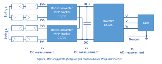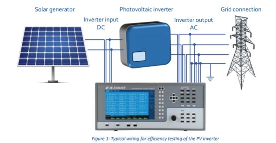 为了减小在转换过程中的功率损耗,逆变器需要不断提高效率。典型的逆变器效率一般在96%左右。功率分析仪可以测量太阳能发电机产生的能量,逆变器的效率以及通过逆变器输送进电网的能量。根据光伏组串的布线,每个组串会有自己的Z大功率跟踪器(MTT)。光伏组串的各逆变器都是大功率逆变器,通常是三相交流输出。