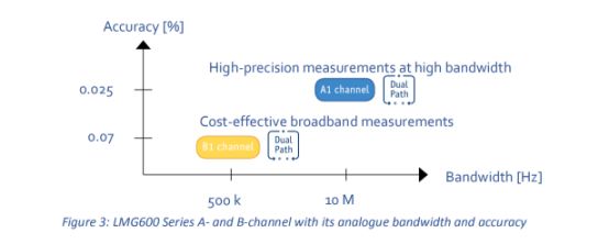 LMG600系列功率分析仪根据不同的测试需求可以配置不同精度及带宽范围的功率模块,图3是A1模块和B1模块的精度及带宽范围的说明。