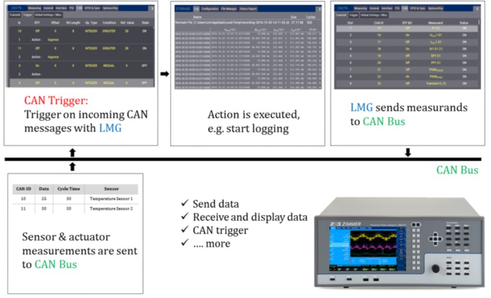 LMG600还可以读取通过CAN总线发送的信息并根据其内容执行一些预定义的动作。也就是说,LMG600上的CAN通讯接口是双向的,从单纯的被动传感器转变成了可远程控制的分析工具。这个特点提供了一个方便的方法,比如基于环境条件来触发数据记录或者是根据待测物的状态来切换测量量程。